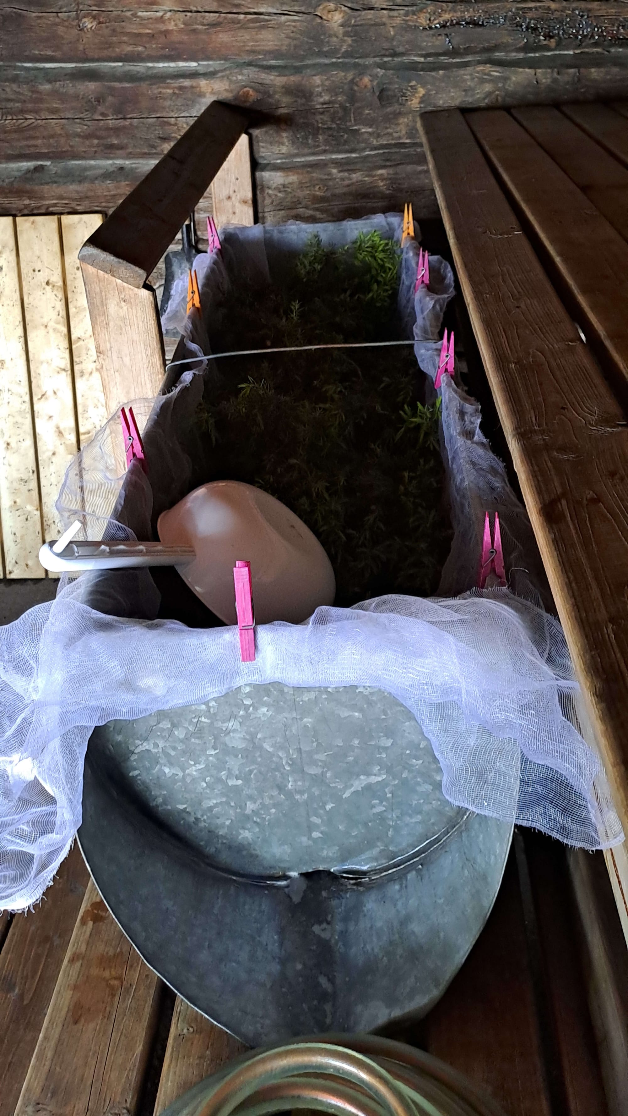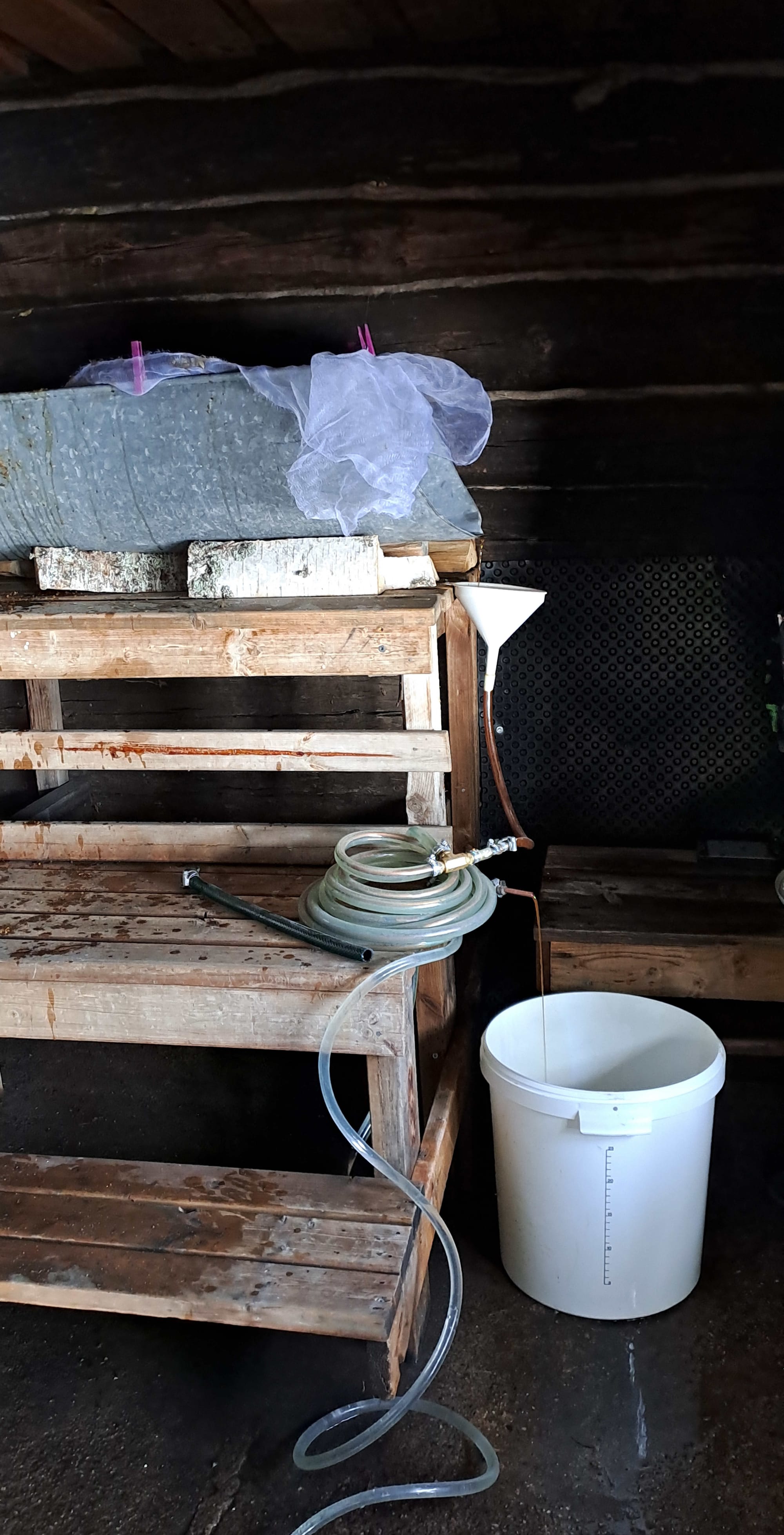 Dans le kuurna : des tasseaux, puis une toile qui sert de tamis. Le kuurna est incliné pour que ça coule à angle régulier, pas trop fortement.