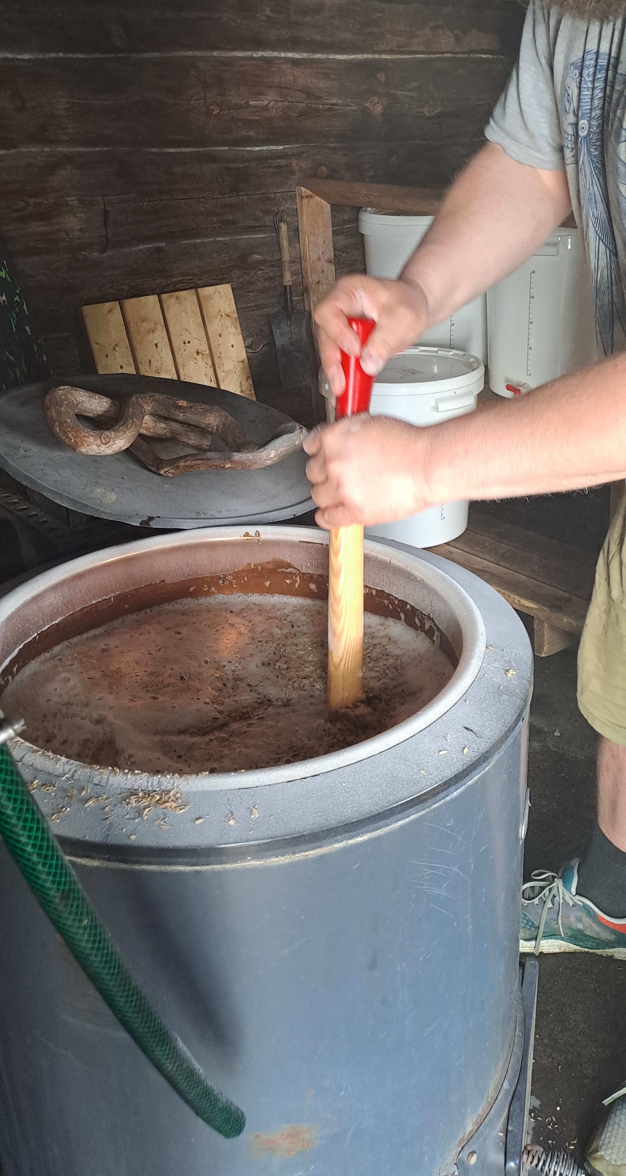 L’eau infusée a bouilli et le trop-plein sert à stériliser le kuurna et le kataja (et les seaux, et tout le matériel). Ajout d’eau froide pour atteindre la bonne température (48-50 degrés.) puis ajout du malt Vinking (25 kg) et du malt de kotikalja (2 kg) dans environ 40 L. La température est maintenue à 48 degrés pendant 30 à 45 minutes, puis augmentée (sans dépasser 78°) Au total, 3:00 à brasser.
